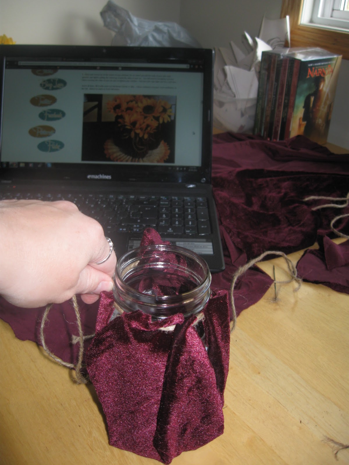 All we did was cut our a squarish (i'm not very good at cutting straight) piece. Put the jar in the middle and pulled it up and stuffed it inside and tied the string tight and put the flowers in!